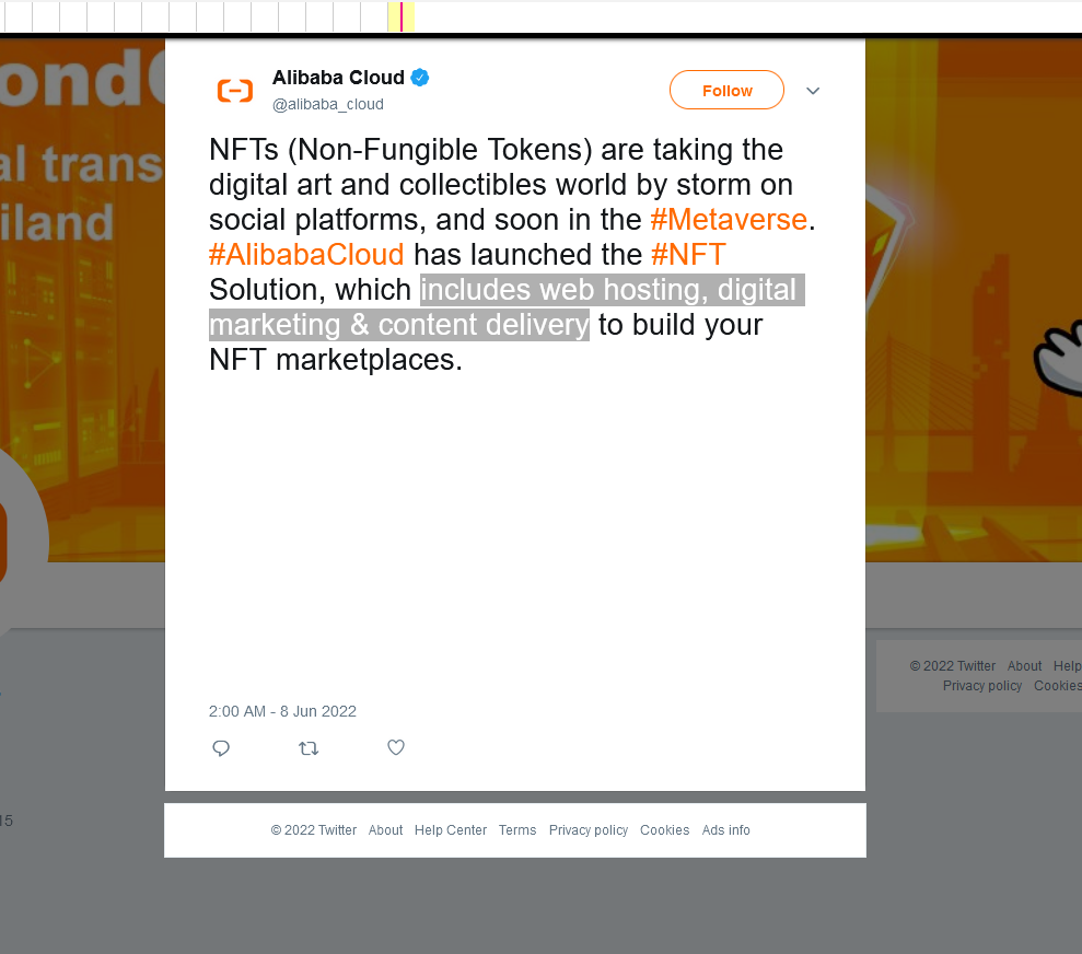 Under the Metaverse solution, the company does note that NFTs can be integrated into a Metaverse built off of Alibaba’s services, but the firm does not provide any of that specific infrastructure.