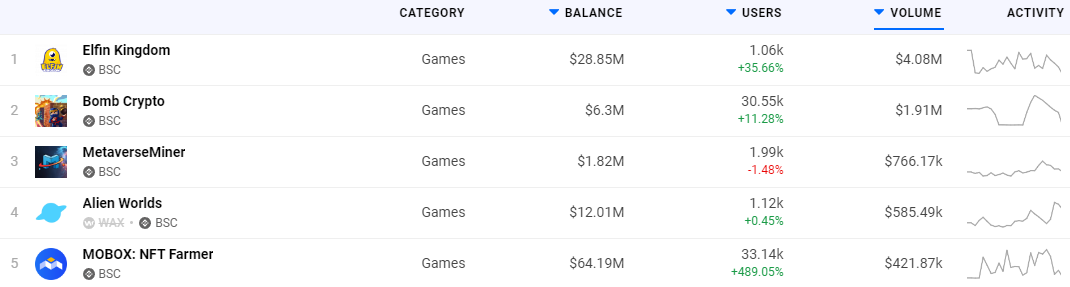 According to data provided by DappRadar, the most popular games on BSC include Elfin Kingdom, Bomb Crypto, Metaverse Miner, Alien Worlds and Mobox: NFT Farmer.