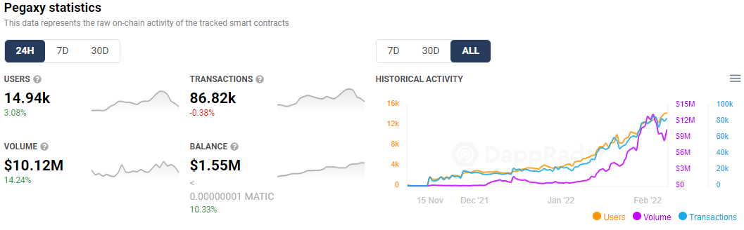 According to data provided by DappRadar, the most popular game on the Polygon network is Pegaxy, a free-to-play mech-horse racing game where users enter mythological creatures called Pega into player-versus-player races to compete for a chance to win monetary rewards.