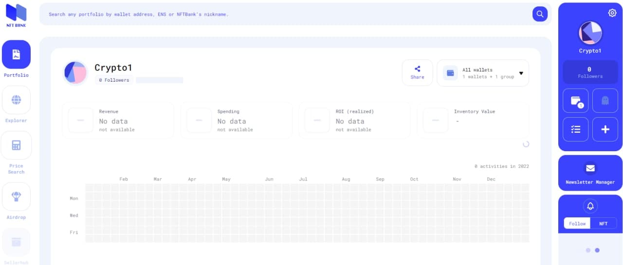 NFTBank is a free-to-use portfolio tracker that is specifically designed to help users manage their NFT holdings by providing a variety of tools to help with tracking and research.