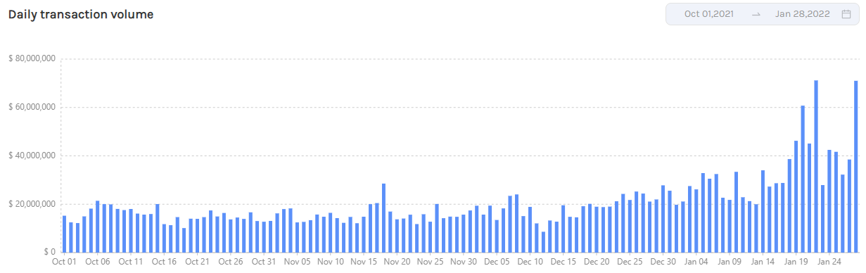 Similar to the transfer trend seen with Synapse, the transaction volume on cBridge has gotten noticeably higher in 2022 with a record $71.12 million being transacted on Jan. 22.