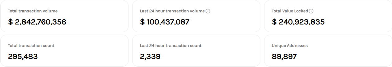 A total of 89,897 unique addresses have interacted with the protocol since inception and have conducted a total of $2.842 billion in transaction volume.