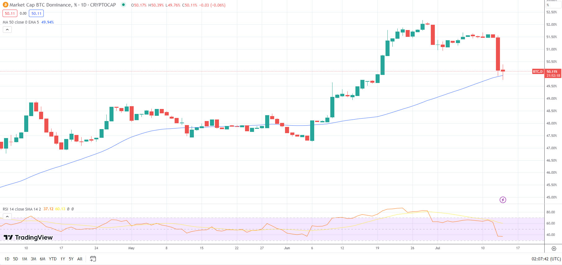 Bitcoin dominance — the measure of how much Bitcoin makes up of the total crypto market cap — fell to 49.76% during Asian trading on July 14, according to Tradingview.