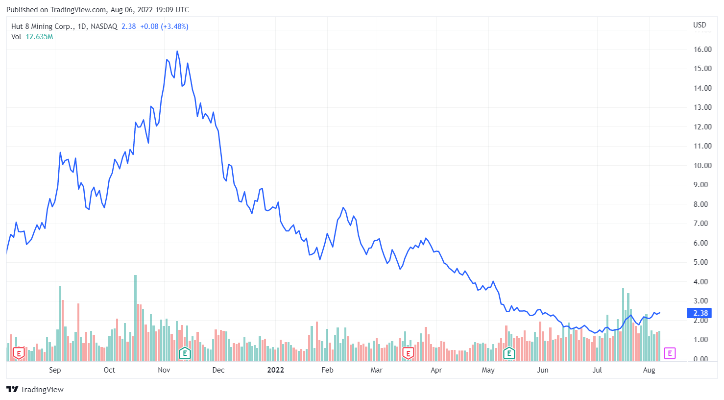 Shares of HUT 8 rallied 3.5% on Friday to settle at $2.38. The stock is down nearly 70% year-to-date and 80% from its peak on Nov. 8, 2021, when Bitcoin was trading near $70,000.