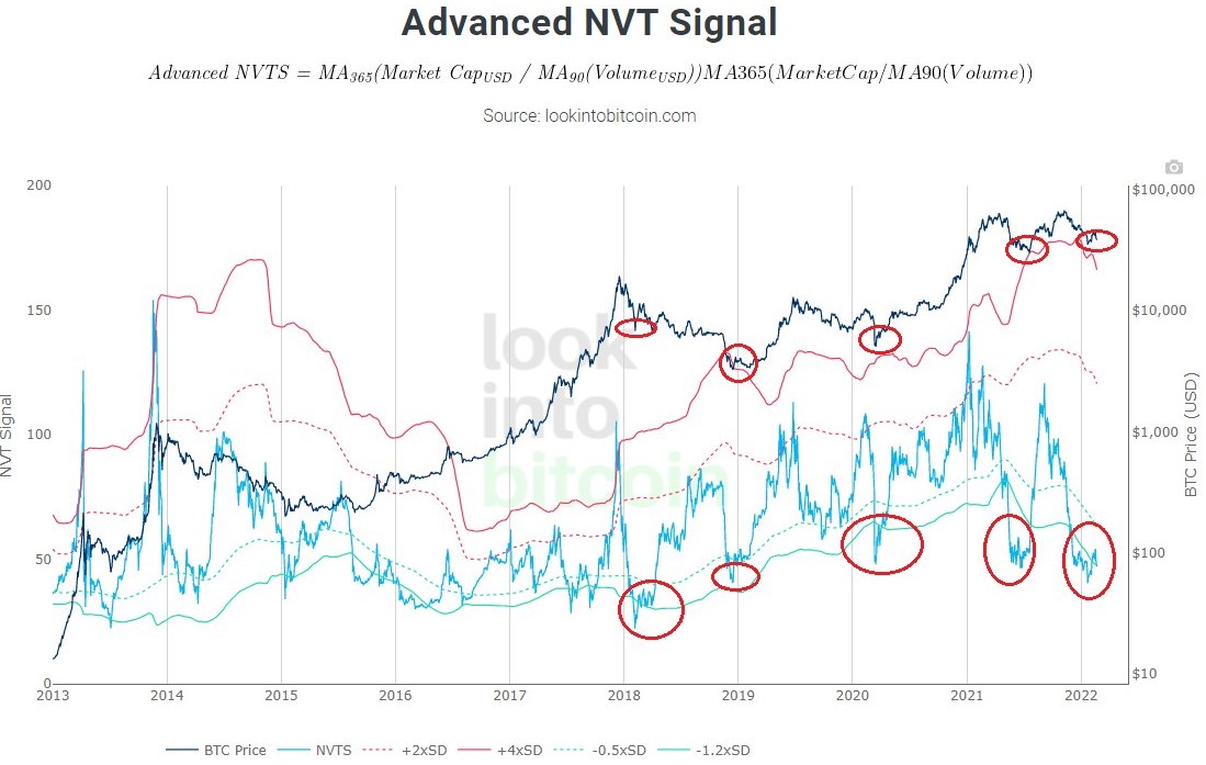 A final bit of insight based sentiment in the Bitcoin market was offered by market analyst and pseudonymous Twitter user ‘Crypto5max’, who noted that “based on sentiment, the end is near” and posted the following chart looking at the Advanced NVT Signal, a metric that divides the value of the Bitcoin market capitalization by the 90-day moving average of its daily transaction value.