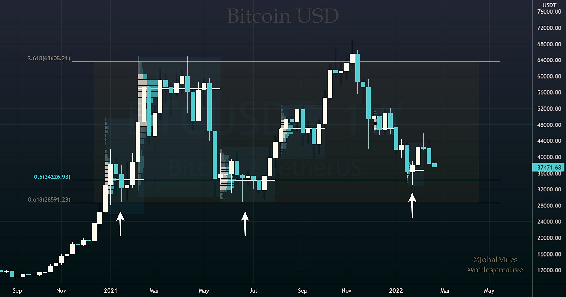 A call for calm was put out by crypto trader and pseudonymous Twitter user ‘JohalMiles’, who posted the following chart stating, “I sound like a broken record here but it’s hard to believe how bearish people have become and we haven’t even broken OR tested $30,000.”