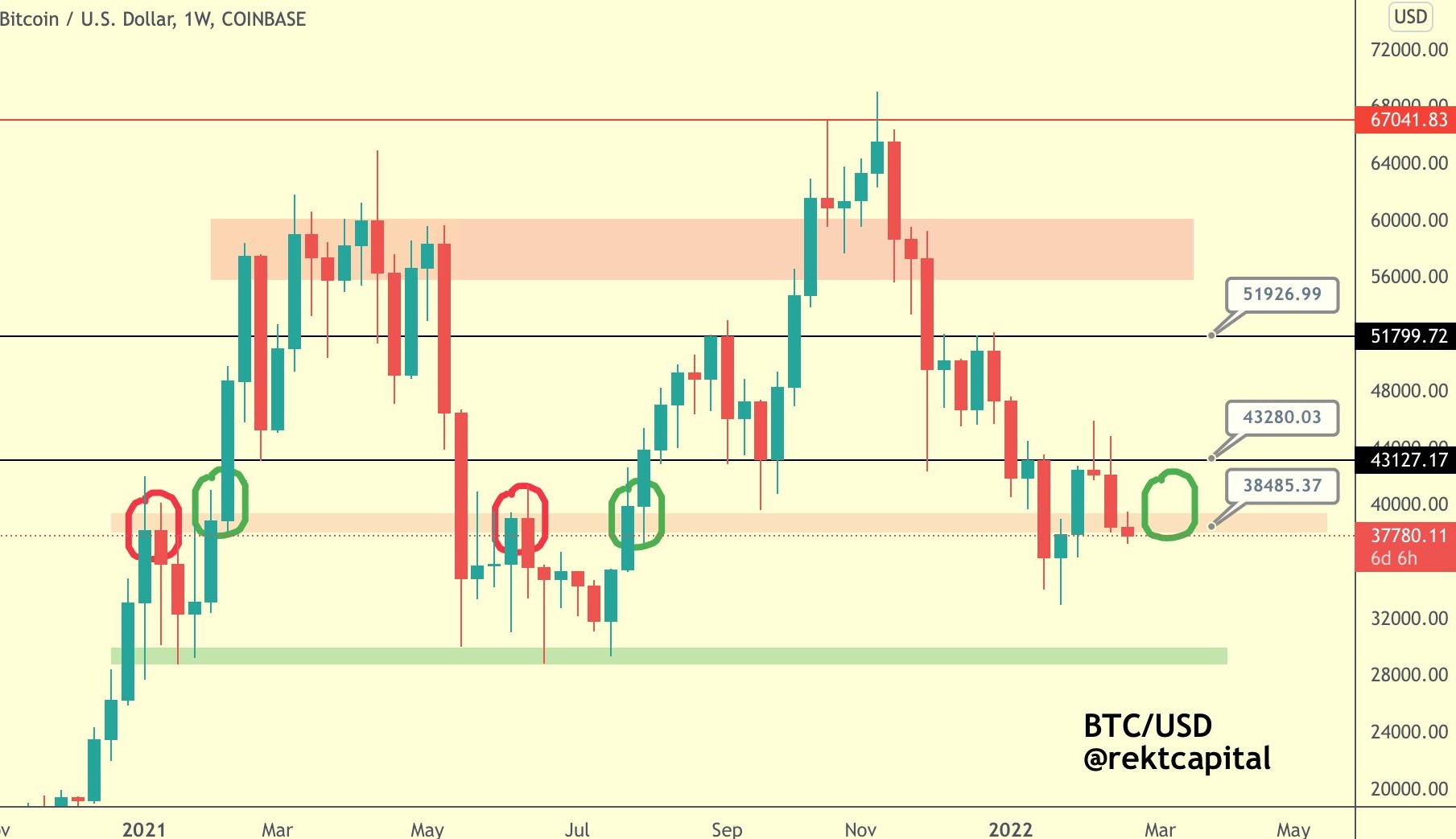 The cyclical nature of BTC price movements was touched upon by crypto analyst and pseudonymous Twitter user ‘Rekt Capital’, who posted the following chart showing that Bitcoin is currently retesting the major support/resistance level at $38,000.