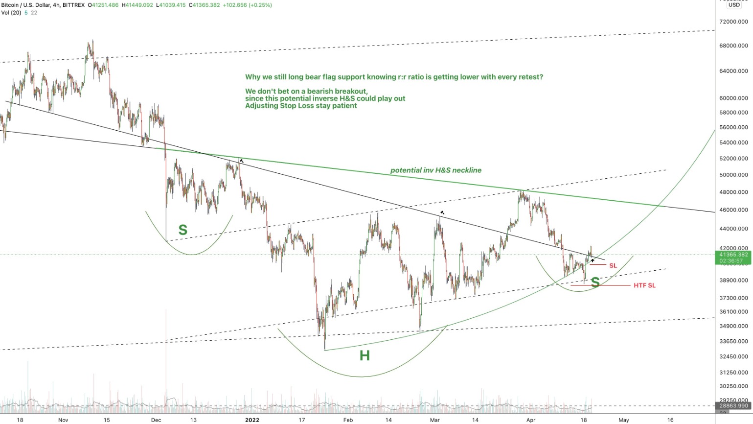 As for the bearish case, a failed retest of $41,300 would result in a “breakout below the bear-flag” and would “also mean S/R flip rising wedge resistance as support.” If this were to occur, Abnessa sees a “minimum dump target of $35,000.”