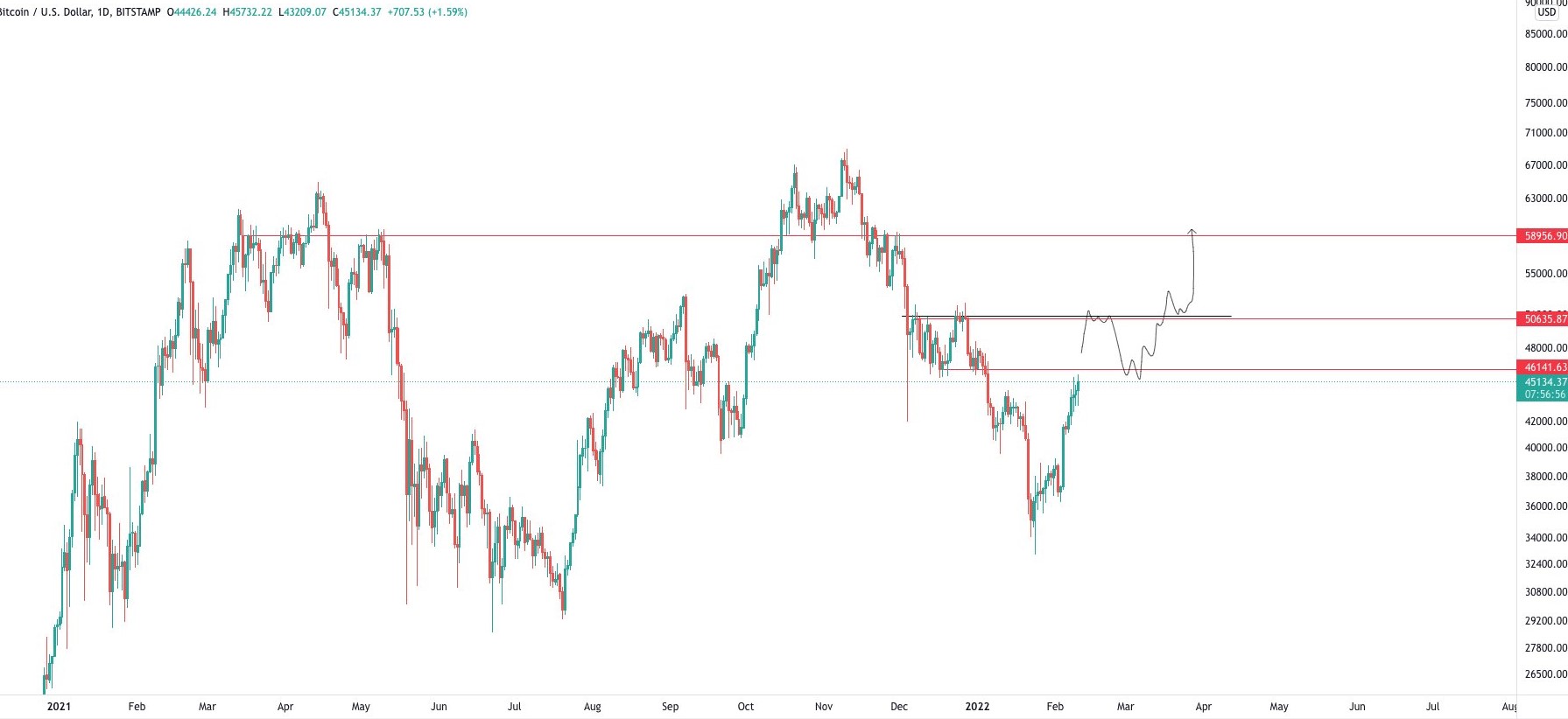 “This is the daily, weekly and monthly supply zones that will likely be a heavy level of resistance. Above this level and we likely see a squeeze towards $50,000.”