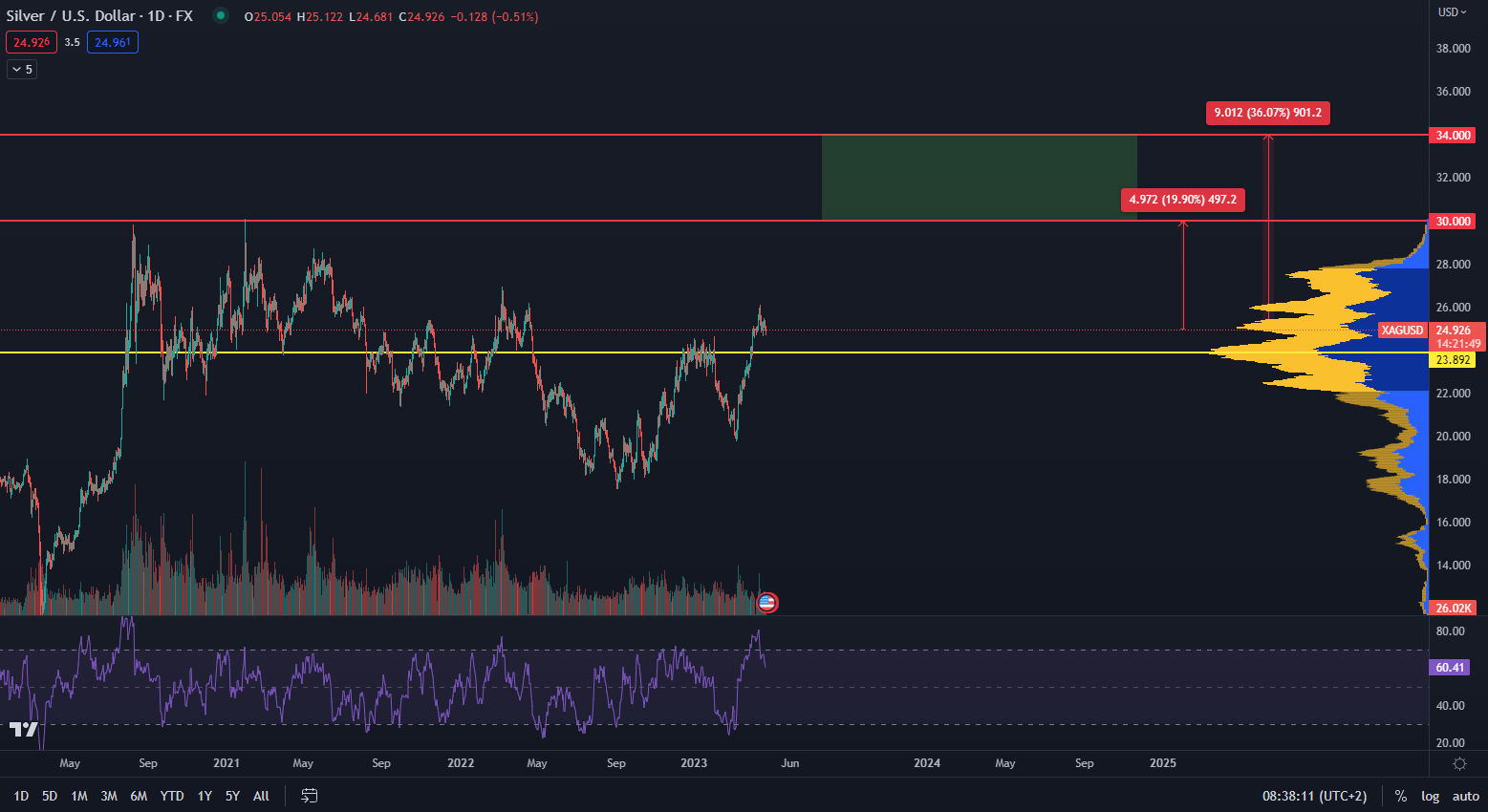 Analytici Citi na čele s Maximilianom Laytonom veria, že striebro v priebehu nasledujúcich mesiacov dosiahne hodnotu 30 až 34 dolárov za uncu. Podľa údajov TradingView sa v súčasnosti obchoduje na trhovej cene 24,92 dolárov za uncu. Aj keď sa cena 30 dolárov na prvé počutie nezdá vysoko, znamenalo by to nárast o ďalších 20 %. Naposledy striebro dosiahlo rovnakú úroveň v januári 2021. Nad 30 dolármi sa obchodovalo ešte vo februári 2013.