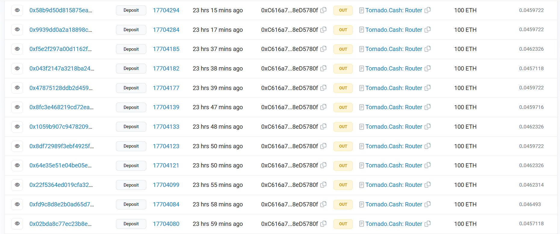 Between July 15 and 16, the illicit funds were moved via Tornado Cash, a decentralized protocol that allows private transactions. The person in possession of the 13,556 ETH divided and moved the funds via 100 ETH per transaction, as shown in the screenshot below.