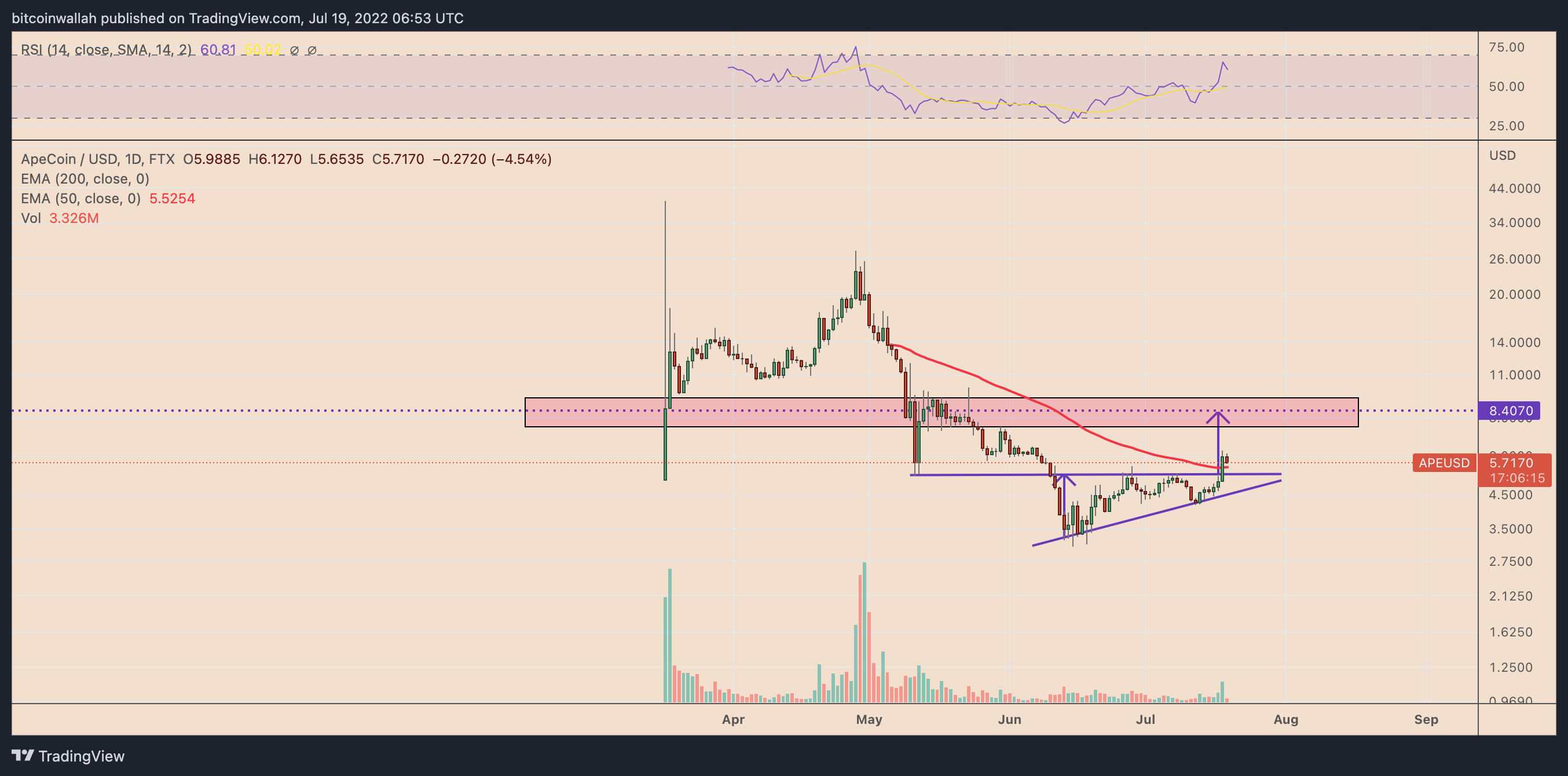 https://images.cointelegraph.com/images/840_aHR0cHM6Ly9zMy5jb2ludGVsZWdyYXBoLmNvbS91cGxvYWRzLzIwMjItMDcvMjE5ODQzNzEtMGJlZC00ZTk2LWE4MzctOWY3ZDQzZjNlNDc3LmpwZWc=.jpegApeCoin (APE) rallied to start the week as traders considered Yuga Labs’ decision to open its Otherside metaverse for selected users. In doing so, the token broke out of a technical pattern that hints at another 45% price rally by September 2022.