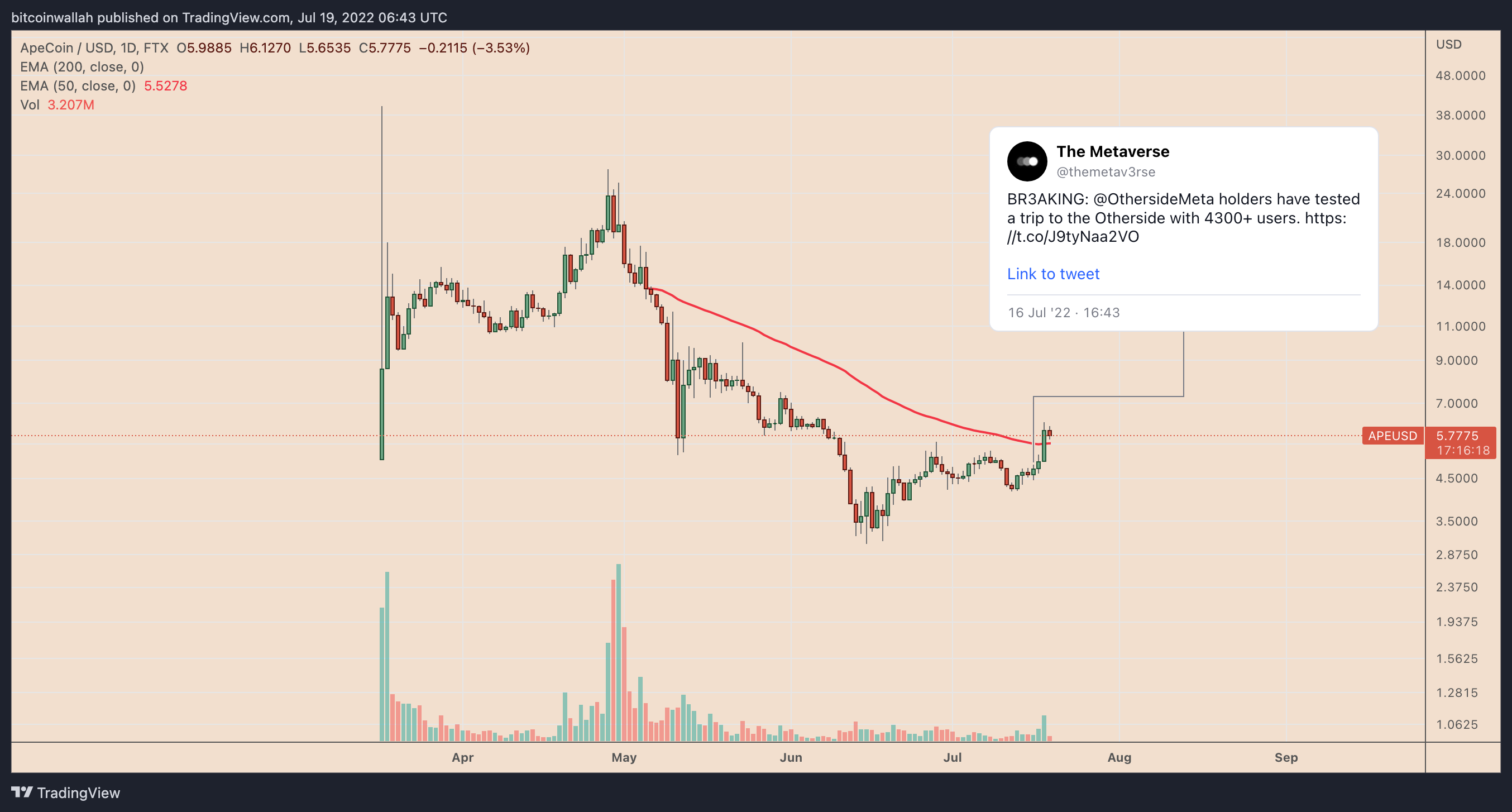 The weekly gains came as a part of a rally that started on July 16. Interestingly, Yuga Labs invited 4,300 players of its Otherside gaming metaverse for a demo—and the tour of its Bored Ape avatar online platform—on the day of APE’s rally.