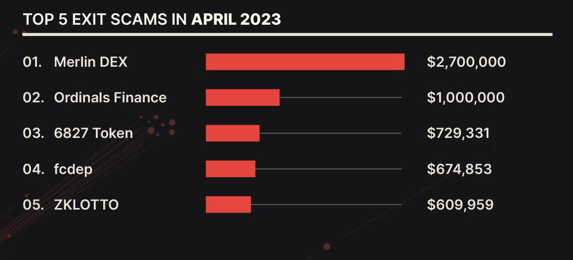 The blockchain security firm noted that total funds lost to exit scams reached $9.4 million in the month, with the top exit scam for the month being Merlin DEX which lost $2.7 million. On April 26, CertiK reported that it was investigating a “potential private key management issue” at the exchange.