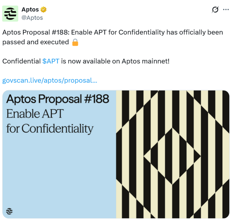 “Confidential APT” launched on the Aptos mainnet on Friday after a governance proposal to integrate the privacy feature passed in a near-unanimous vote. It uses zero-knowledge proofs to conceal token balances and transfer amounts while still enabling transactions to be verified.