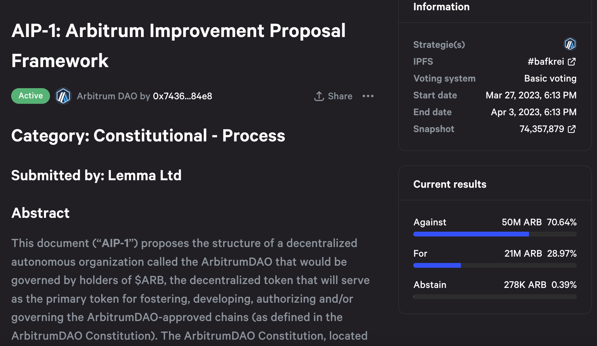 “One of the mistakes in the drafting of AIP-1 was a failure to note at the outset that this proposal was intended to act as a ratification of the initial setup of both the Arbitrum DAO and the Foundation that has been created to serve the DAO. […] the point of AIP-1 was to inform the community of all of the decisions that were made in advance.”