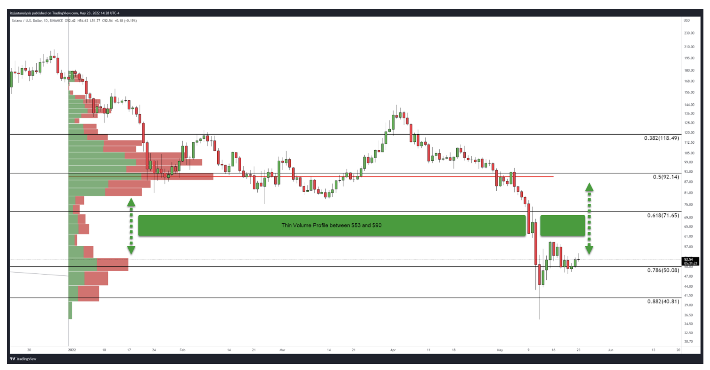 SOL’s upside potential in the short term could be significant with the move, itself, occurring quickly. The 2022 Volume Profile between $53 and $90 is extremely thin, indicating that any daily close above $53 would easily move towards the next high volume node in the $90 value area.
