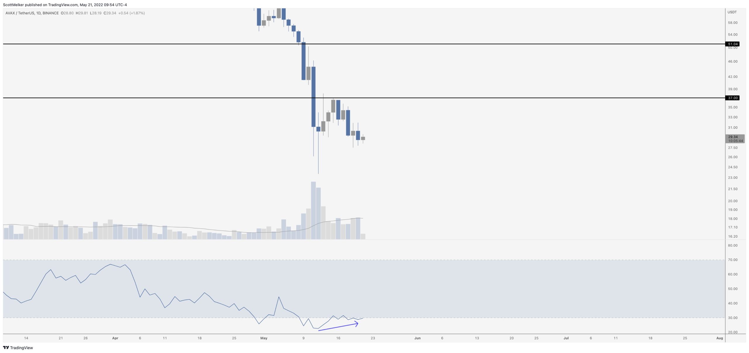 On the brighter note, AVAX shows promise of an interim upside scenario with a divergence between its rising relative strength index (RSI) and falling prices, according to Scott Melker, an independent market analyst.