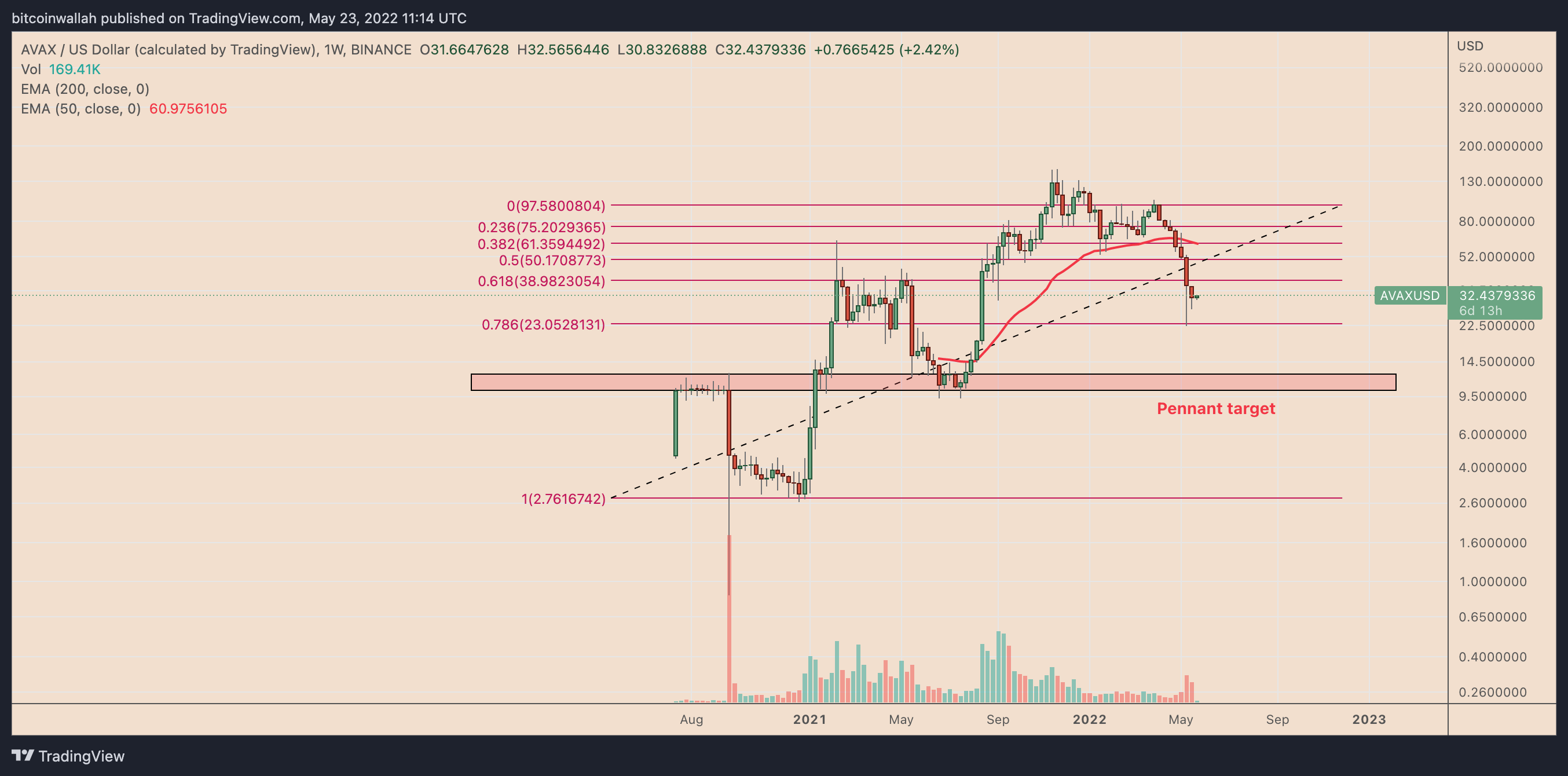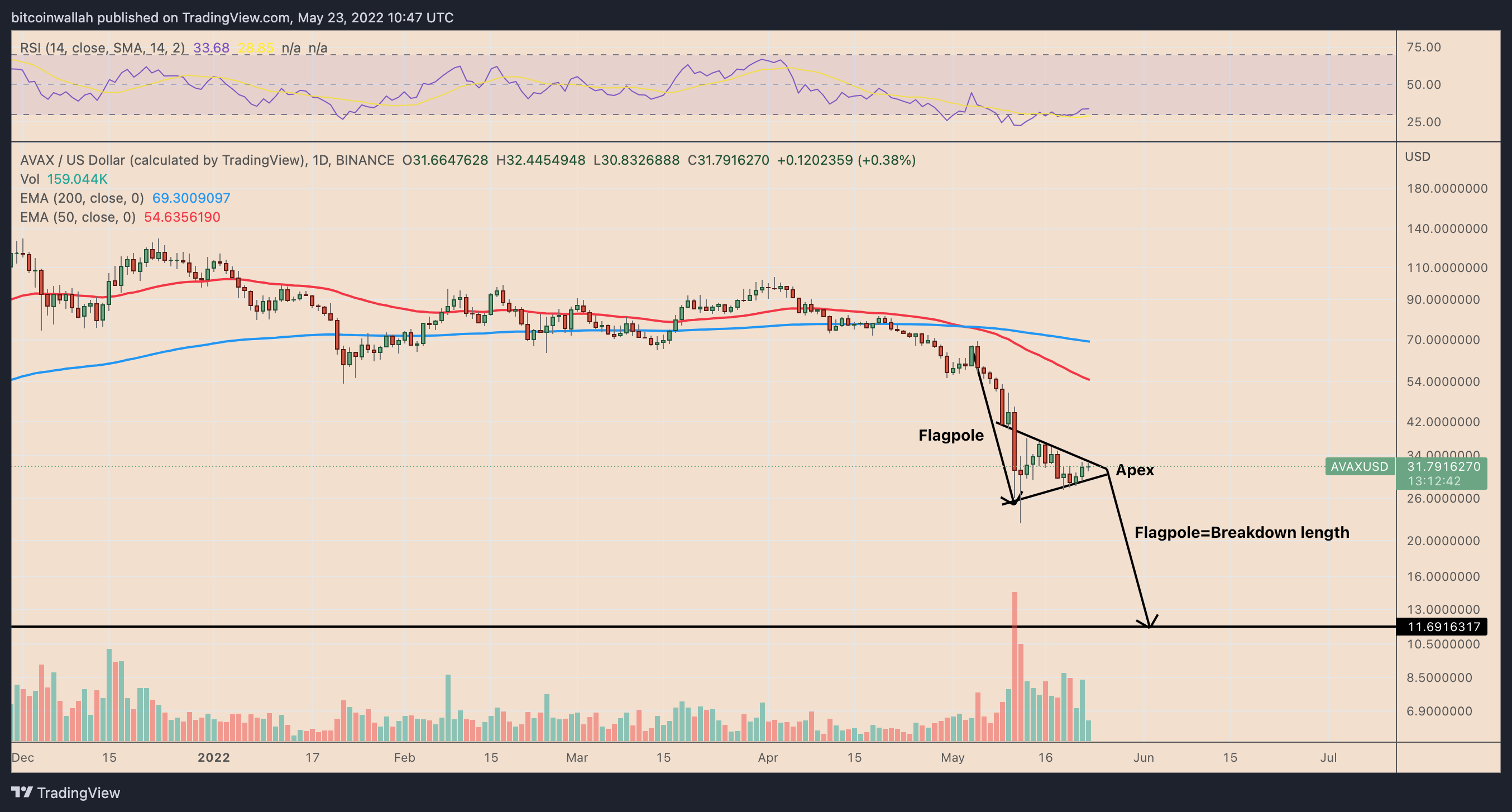 That raises Avalanche’s possibility of retesting $23 as support, followed by a rebound move toward $40. Such a move would risk invalidating the bear pennant setup.