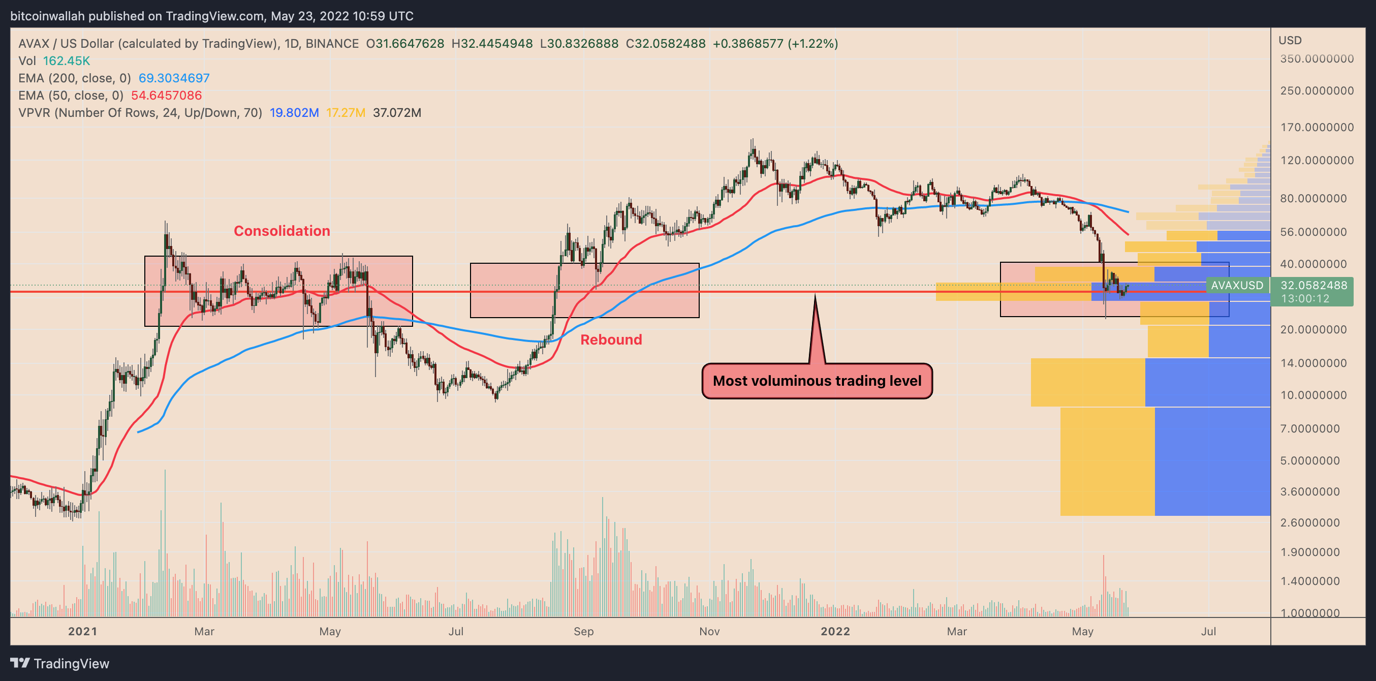 For instance, the Avalanche token’s volume profile shows it trading near its point of control (POC)—the level where the traders were most active since 2021—around $32.