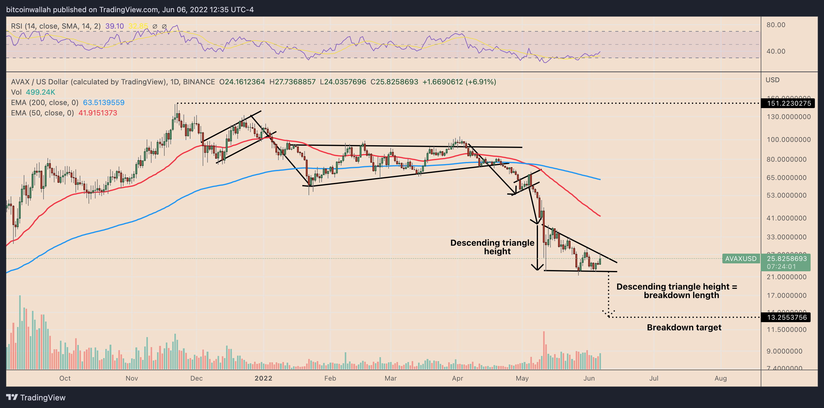 That puts AVAX’s descending triangle near $13.25, almost 50% below June 6’s price.
