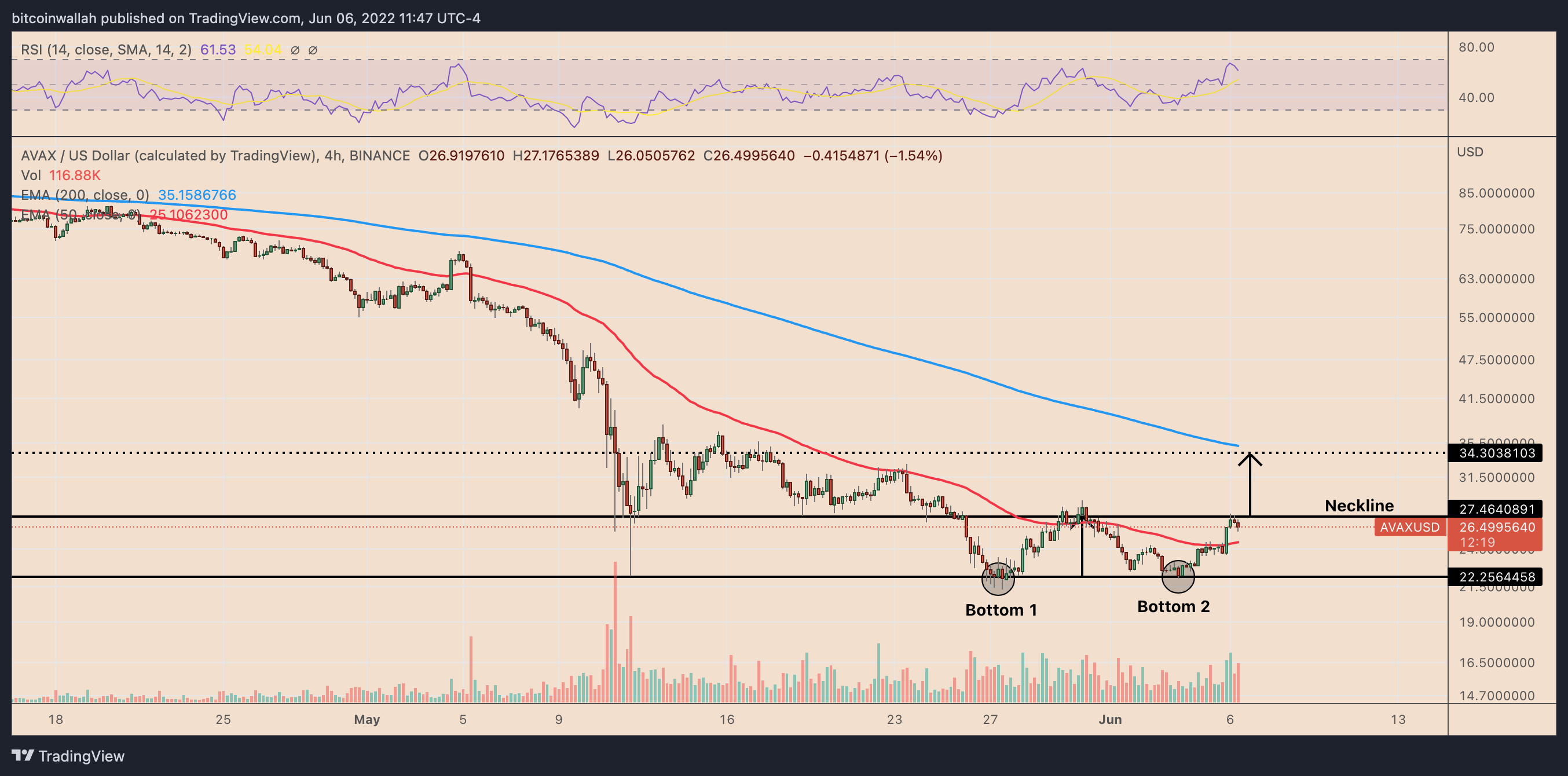 Since May 27, AVAX’s price trends appear like those typically witnessed during the double bottom formation. Specifically, the AVAX/USD pair on the four-hour chart has bounced twice after testing the same support level near $22.25, and now eyes a breakout above its resistance level — also called “neckline” — near $27.50.