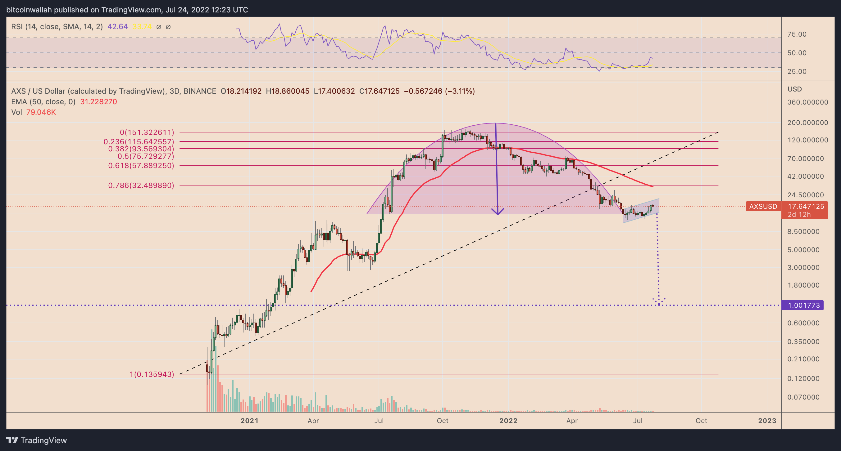 https://images.cointelegraph.com/images/840_aHR0cHM6Ly9zMy5jb2ludGVsZWdyYXBoLmNvbS91cGxvYWRzLzIwMjItMDcvZTZiN2RjODQtYjNlNy00YzU4LTliNzItMDkwMTE0Mzc2NTc4LmpwZWc=.jpegAxie Infinity (AXS) has been forming a giant bearish reversal pattern since July last year, which could send its prices down by another 95% in 2022.