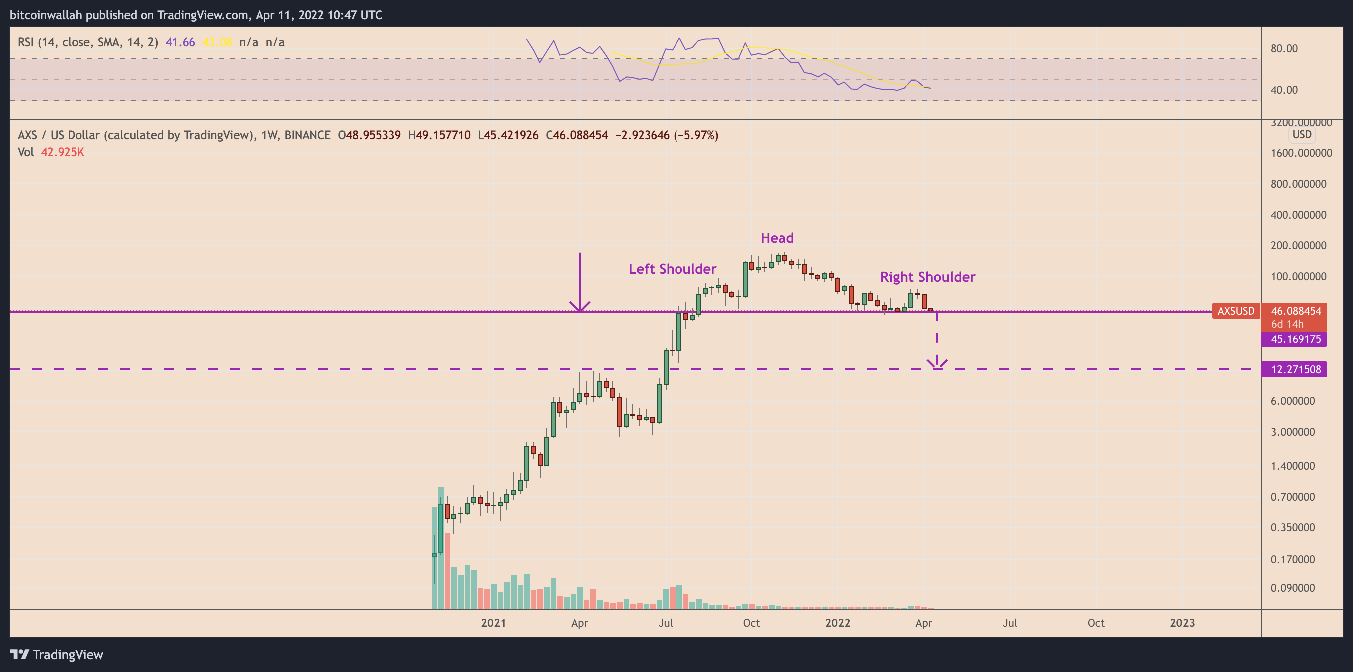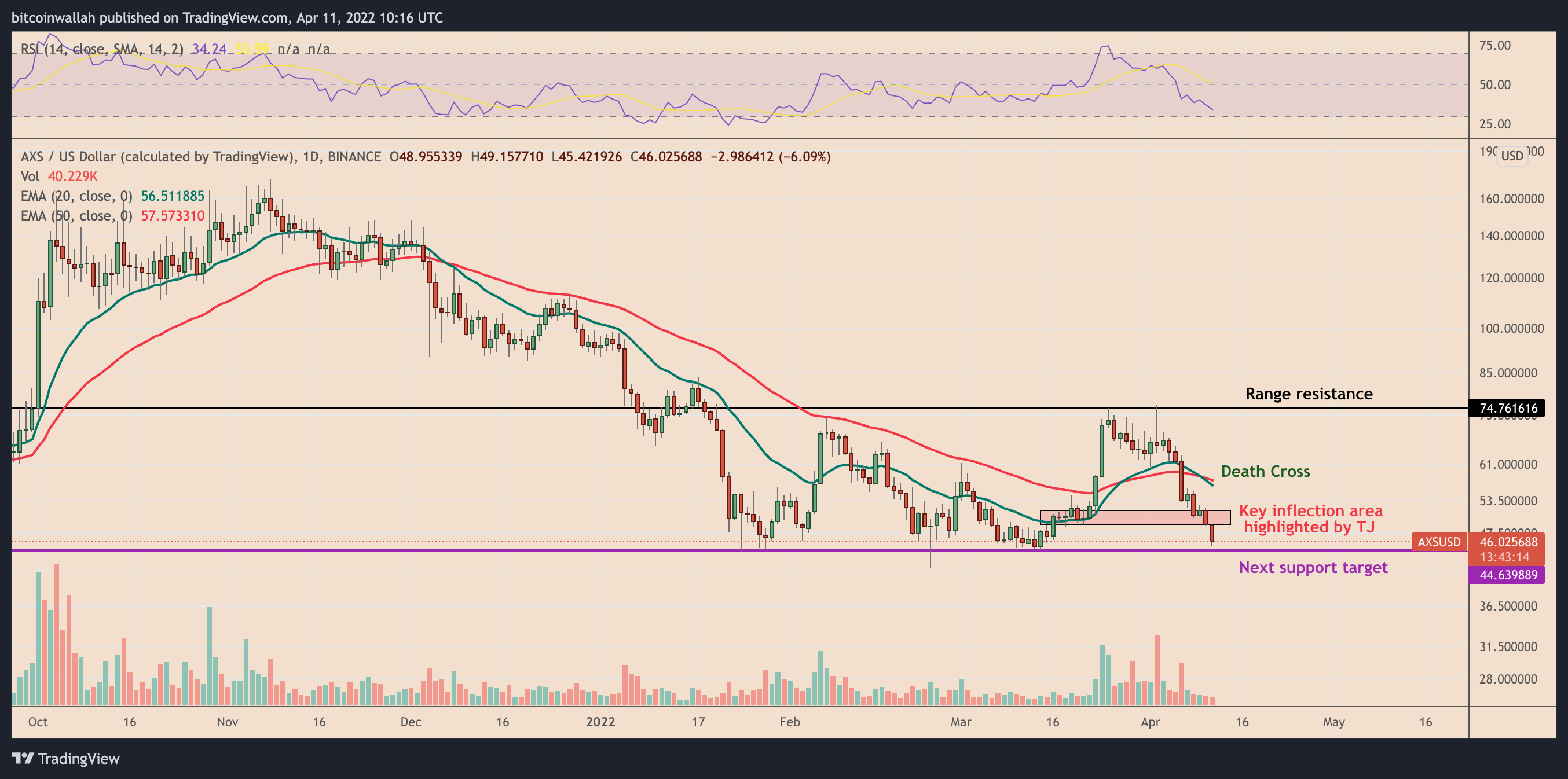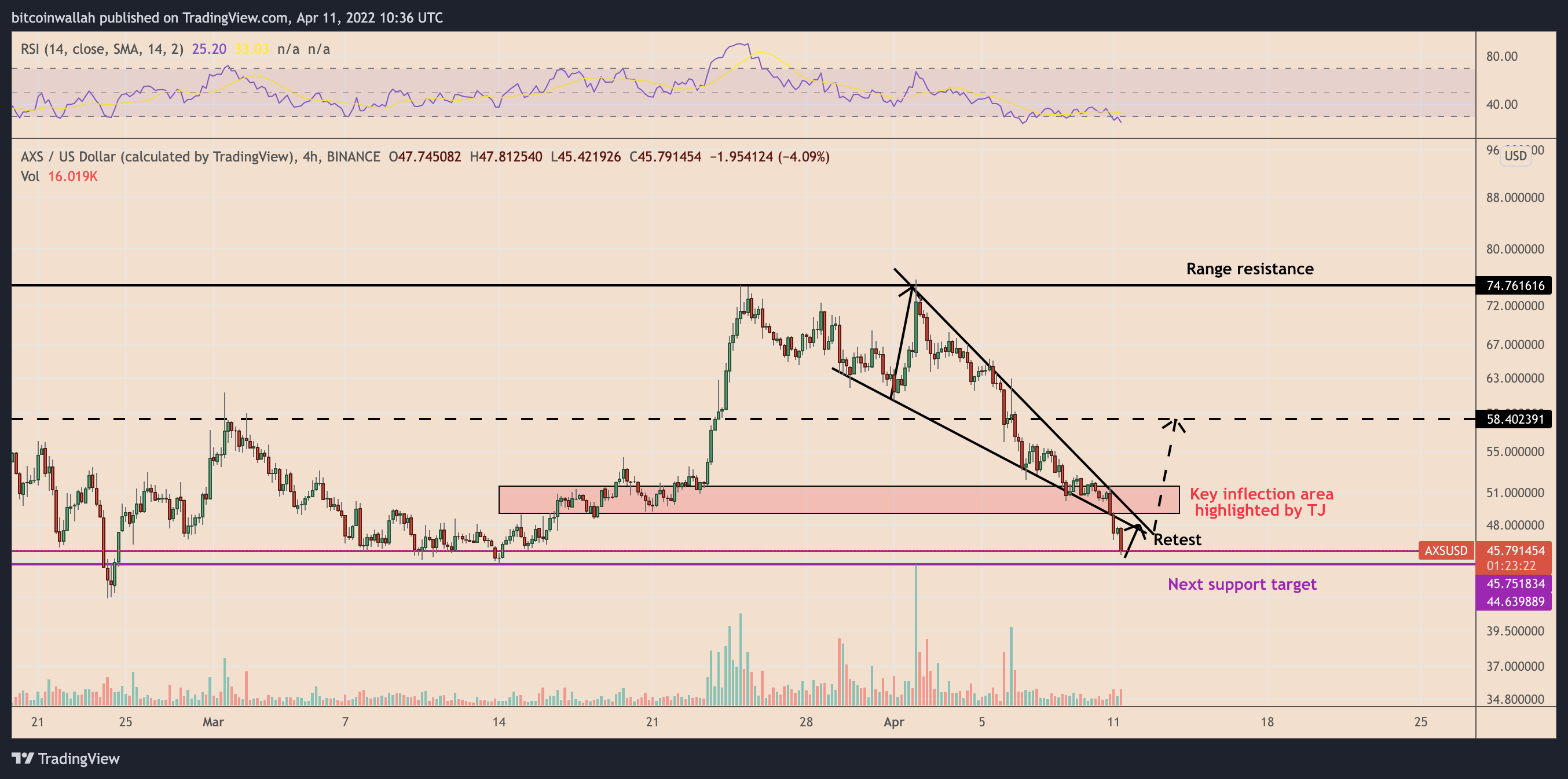 AXS’s price is already “oversold” on its four-hour chart, according to its RSI readings near 25. Meanwhile, AXS is breaking out of its prevailing falling wedge pattern to the downside despite it being a bullish reversal pattern in theory.