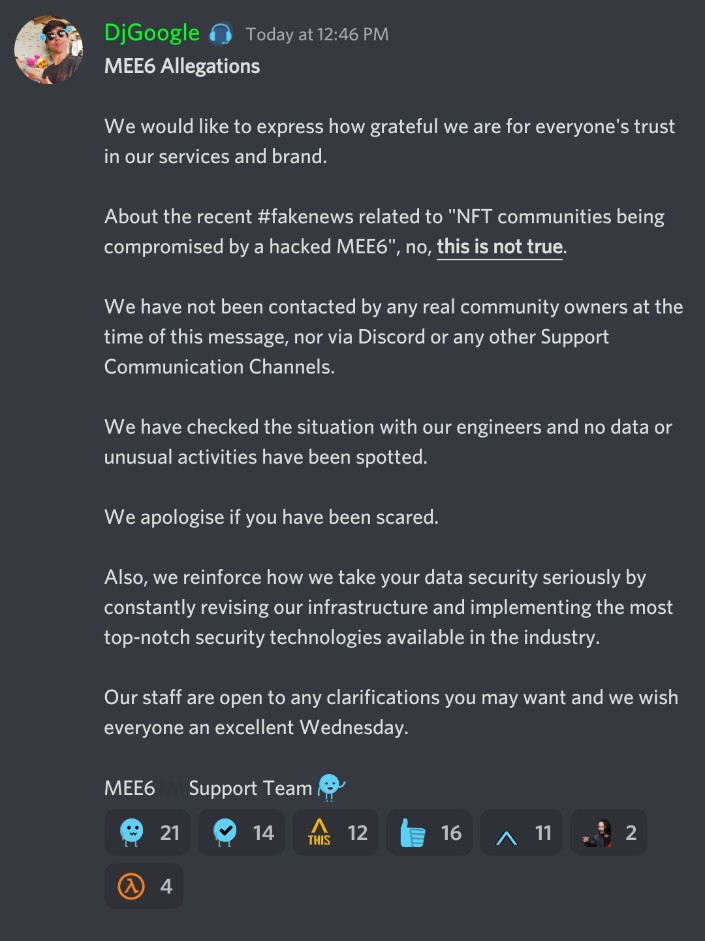 The developers also claimed that the compromise of MEE6 is not a new phenomenon and many projects have faced similar issues. However, the official MEE6 Discord support channel denied allegations of a hack and claimed they have verified with their engineers and didn’t see any unusual activity.