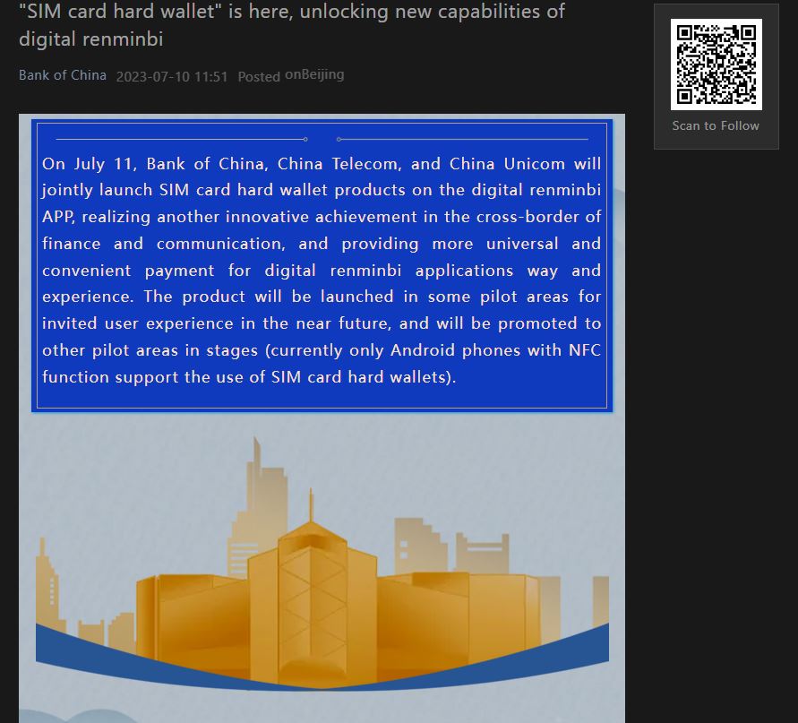 https://images.cointelegraph.com/cdn-cgi/image/format=auto,onerror=redirect,quality=90,width=840/https://s3.cointelegraph.com/uploads/2023-07/11dfd6b4-88d1-4394-8eb8-c22d4e5fcb17.jpgThe bank plans to enable users to make phone payments by integrating its digital yuan app with specialized “super SIM cards” with near-field communication capabilities.