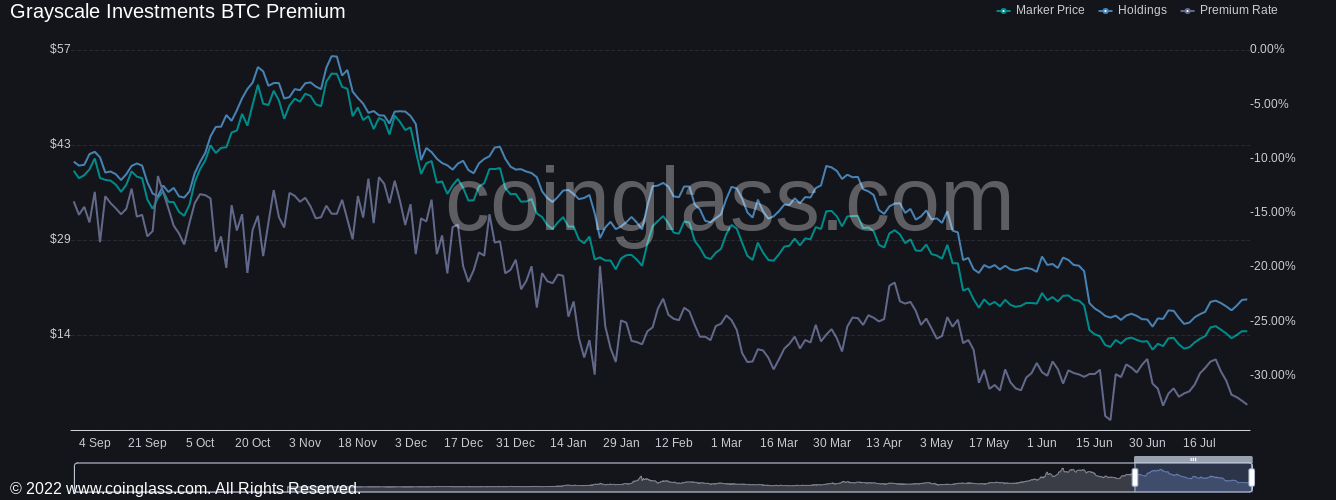The fund’s premium to spot price, long in fact a discount, is now circling record lows of nearly 35%, data from Coinglass confirms.