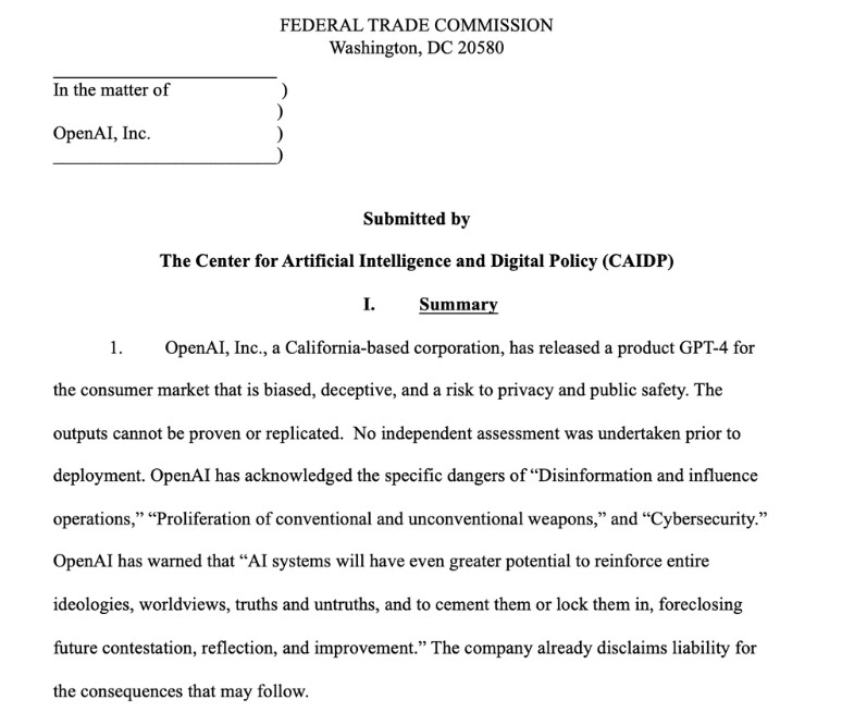 “It is time for the FTC to act […] CAIDP urges the FTC to open an investigation into OpenAI, enjoin further commercial releases of GPT-4, and ensure the establishment of necessary guardrails to protect consumers, businesses, and the commercial marketplace.”