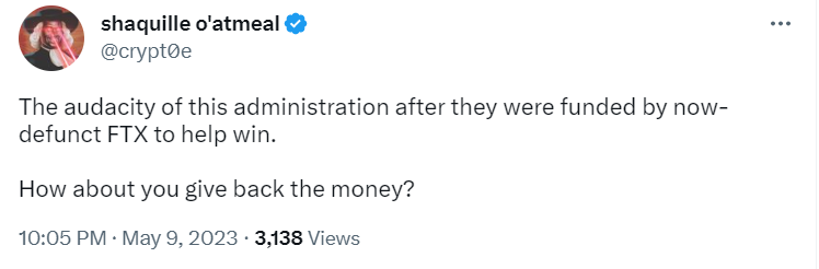 Meanwhile, another community member was seemingly frustrated, calling out the administration for going after crypto while receiving funding from the former FTX CEO Sam Bankman-Fried.