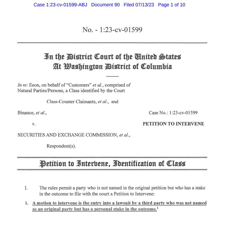 As stated in the filing with the District Court for the District of Columbia, Eeon claims that the SEC and Binance’s attorneys have failed to sufficiently represent the interests of Binance’s customers, leading Eeon to seek representation for them.