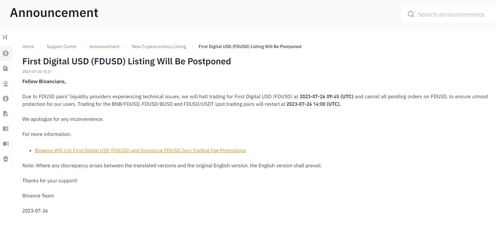 The recently introduced stablecoin, First Digital USD (FDUSD), which was scheduled to be listed on Binance on July 26, 2023, at 8:00 am UTC, has been postponed until 2:00 pm UTC on July 26 due to FDUSD pairs’ liquidity providers experiencing technical issues.