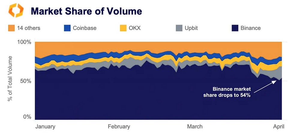 In an April 4 newsletter blockchain analytics platform Kaiko reported Binance “lost 16% market share of trade volume,” with its market share at 54% as of the end of Q1.