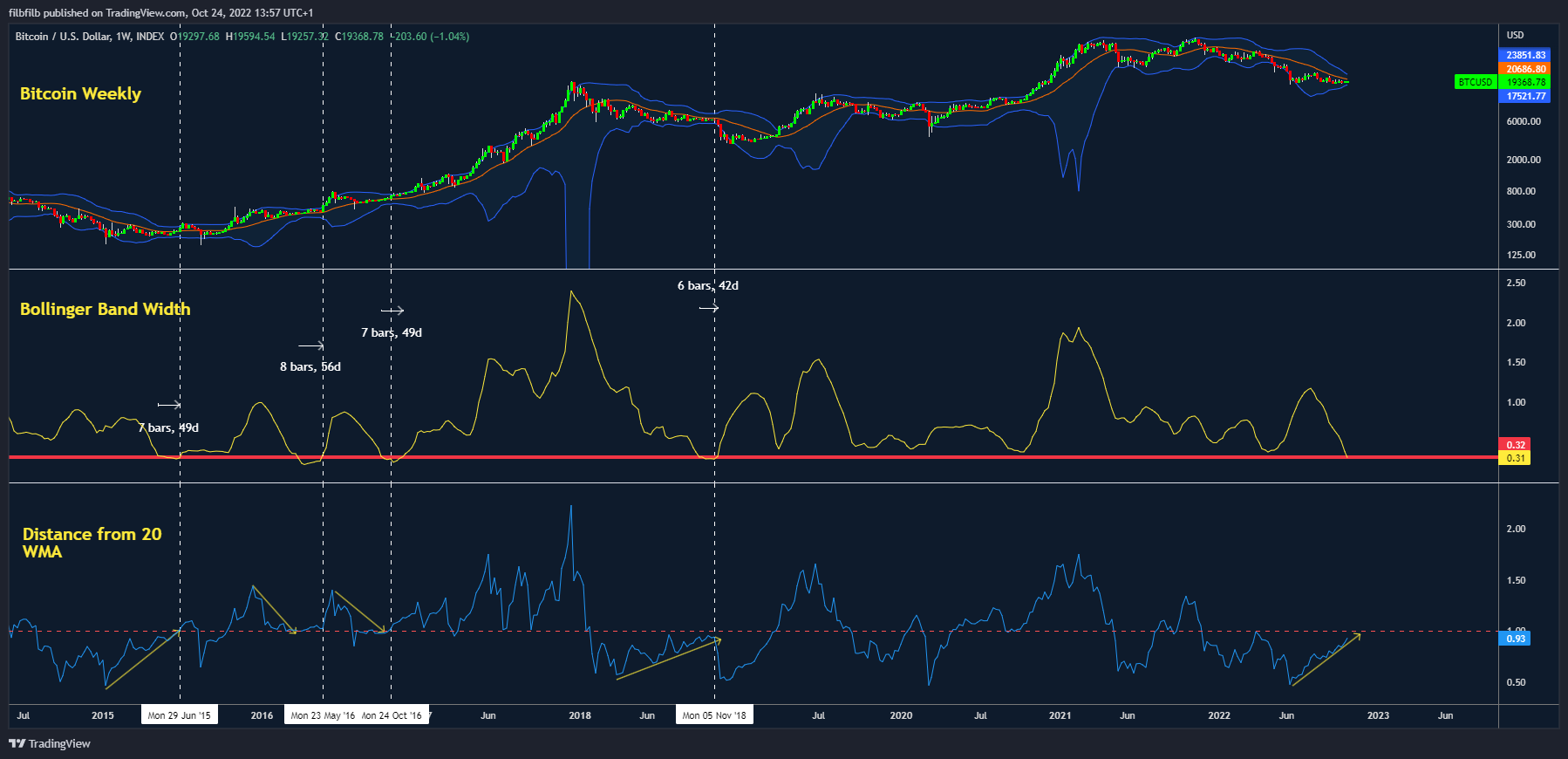 As noted by Filbfilb, co-founder of trading suite DecenTrader, Bitcoin’s Bollinger Bands continue to contract on weekly timeframes, reaching rare levels.