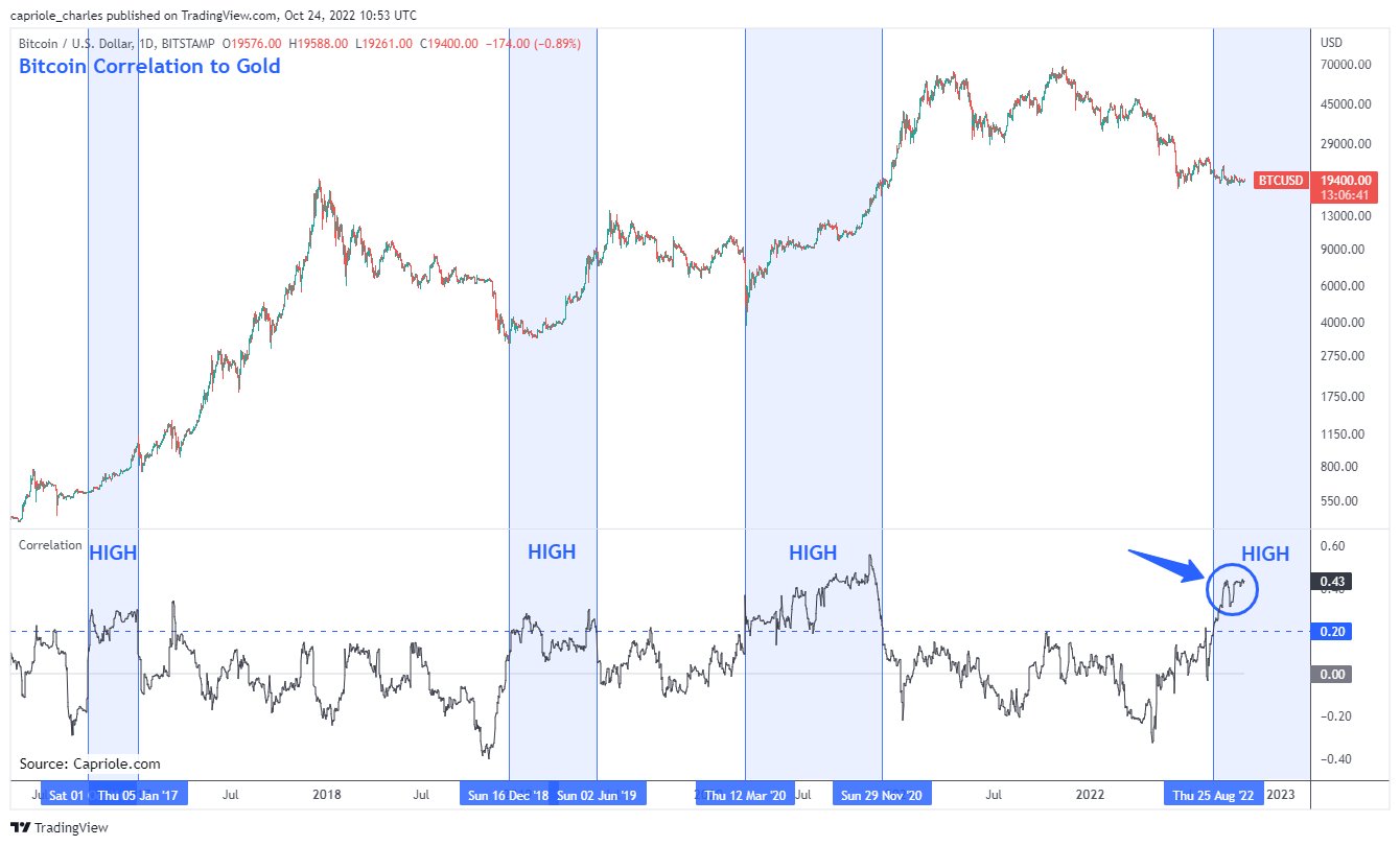 Whether up or down, Bitcoin’s current increasing correlation with gold was something to take note of, Charles Edwards, founder of asset manager Capriole, added.