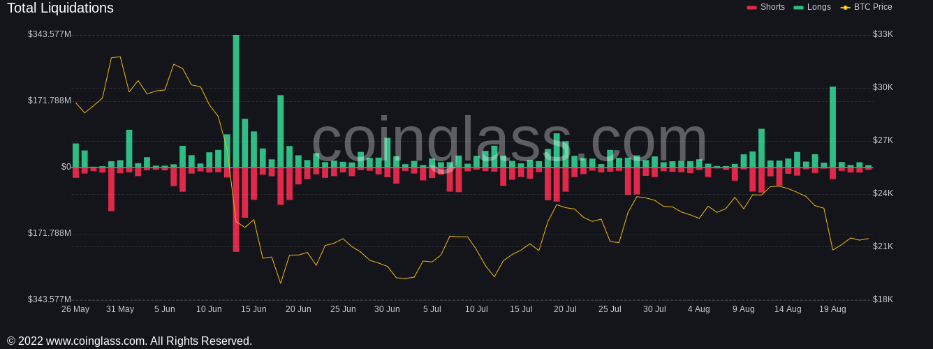 Aug. 19 sealed a total of $209.5 million in long position liquidations on exchanges — the most since June 13 — along with $30 million of short positions.