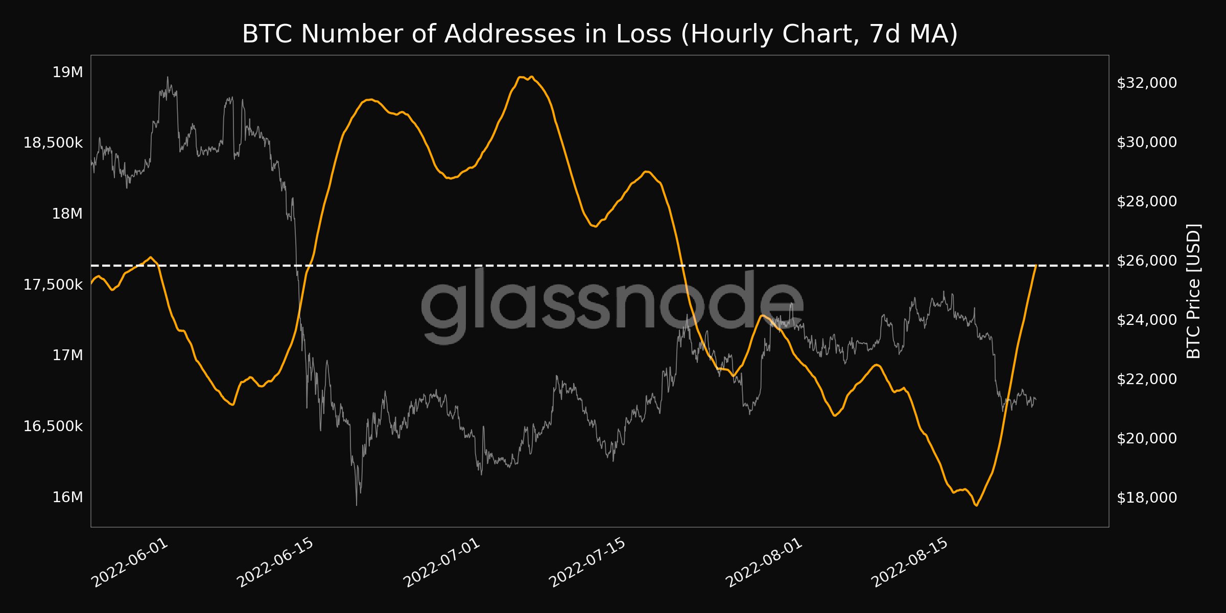 Data from on-chain analytics firm Glassnode shows more wallets are in the red as of Aug. 23 than at any time in the past month.