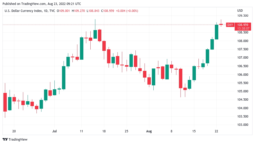 The U.S. dollar index (DXY), with which Bitcoin has shown inverse correlation to varying degrees in recent years, hit its highest since July 14, passing 109 and up 4.4% from its August lows.