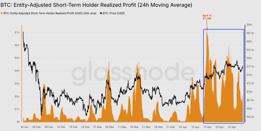 The metric spiked as high as $7.2 million per hour on April 15, about roughly “four times the base level that had established itself since mid-April, confirming that short-term holders seized the rally as a distribution opportunity,” Glassnode said, adding: