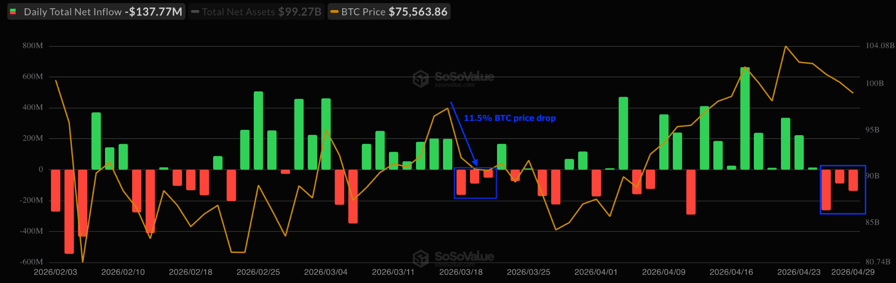 This marked the longest outflow streak since March 20, when a three-day outflow streak accompanied an 11.5% BTC price drop after rejection at $76,000.