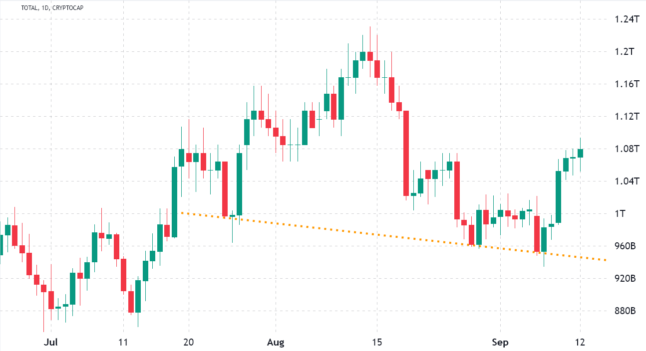 https://images.cointelegraph.com/images/840_aHR0cHM6Ly9zMy5jb2ludGVsZWdyYXBoLmNvbS91cGxvYWRzLzIwMjItMDkvZTlkMjdkYjAtZTJkYi00MDM2LTgwNDEtMTU0MDgzOWJiNTYzLmpwZw==.jpgThe 13% gains in the six days leading to Sept. 12 brought the total crypto market capitalization closer to $1.1 trillion, but this was not enough to break the descending trend. As a result, the overall trend for the past 55 days has been bearish, with the latest support test on Sept. 7 at a $950 billion total market cap.