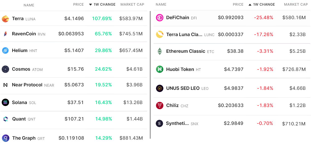 Below are the winners and losers of last week’s total crypto market capitalization 8.3% gain to $1.08 trillion. Bitcoin (BTC) stood out with a 12.5% gain, which led its dominance rate to hit 41.3%, the highest since Aug. 9.