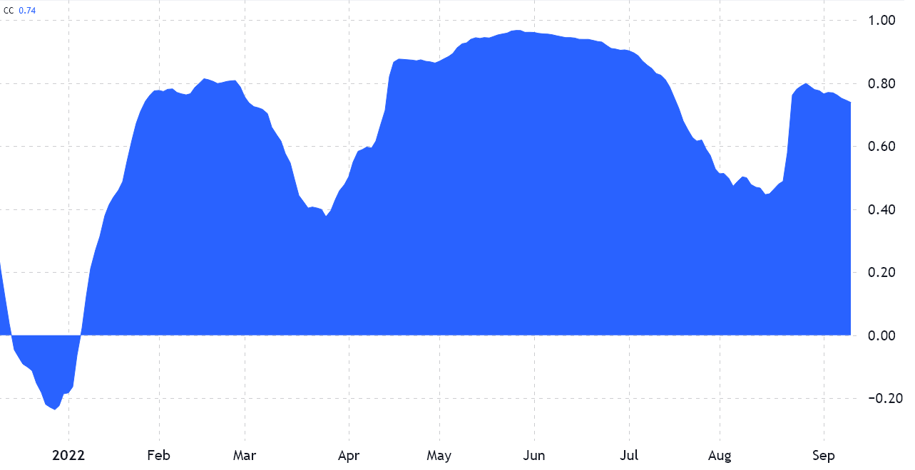 As displayed above, the Nasdaq composite index and Bitcoin 50-day correlation currently stand at 0.74, which has been the norm throughout 2022.