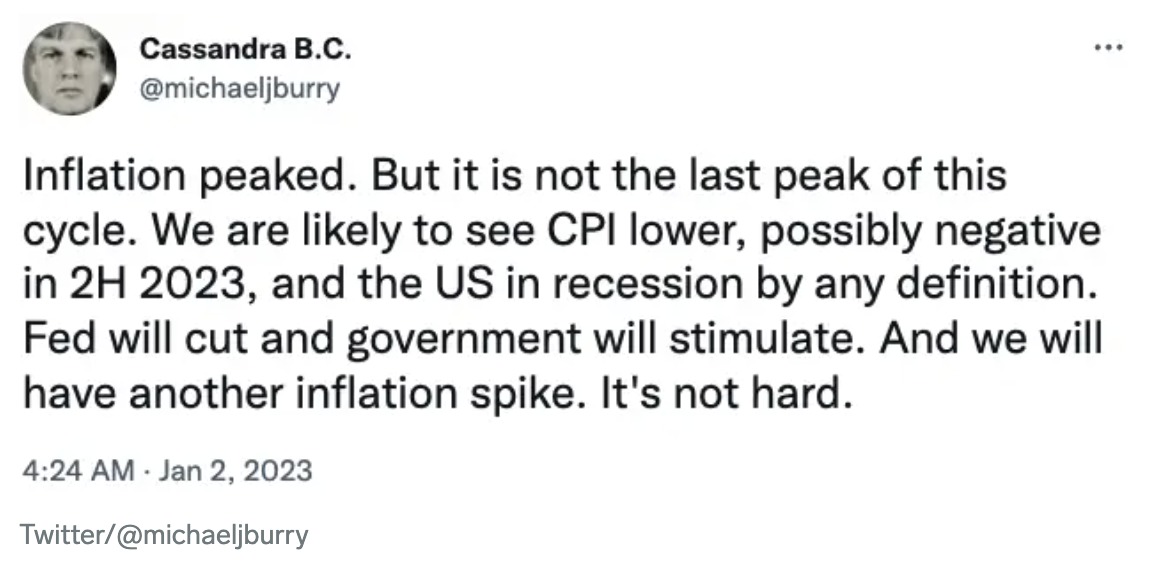 Michael Burry of Big Short fame declared in January that the US could be in recession by late 2023, with CPI lower and the Fed cutting rates (note that today’s CPI print came in much lower than expected, further fueling the recent rally). This would lead to another inflation spike in his view.