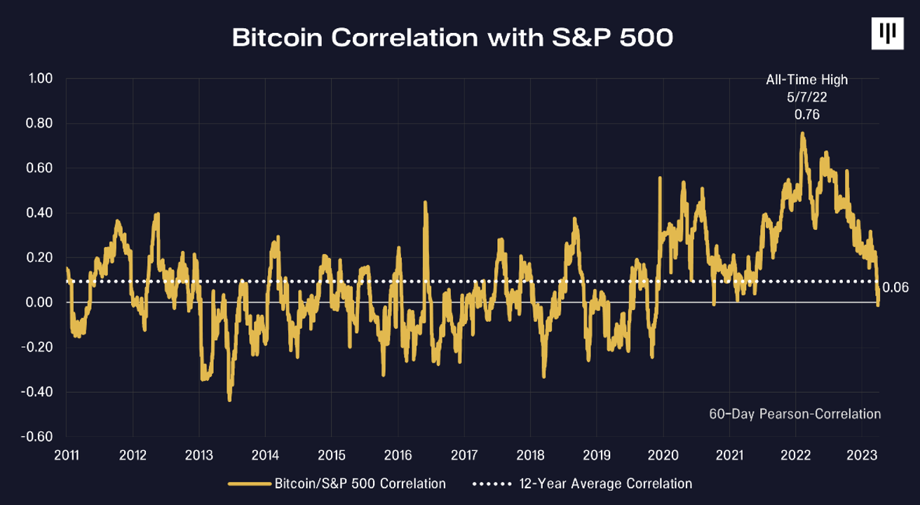 They go on to note that while most other asset classes are sensitive to interest rates, crypto is not. Bitcoin’s correlation to equities during 2022 was driven by the collapse of “over-leveraged centralized entities.” Today, that correlation has reached near-zero levels: