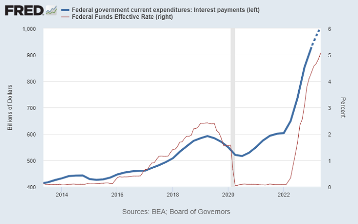 “So as the Federal Reserve raises rates, federal interest expense increases, and the federal deficit widens ironically at a time when deficits were the primary cause of inflation in the first place. It risks being akin to trying to put out a kitchen grease fire with water, which makes intuitive sense but doesn’t work as expected.”