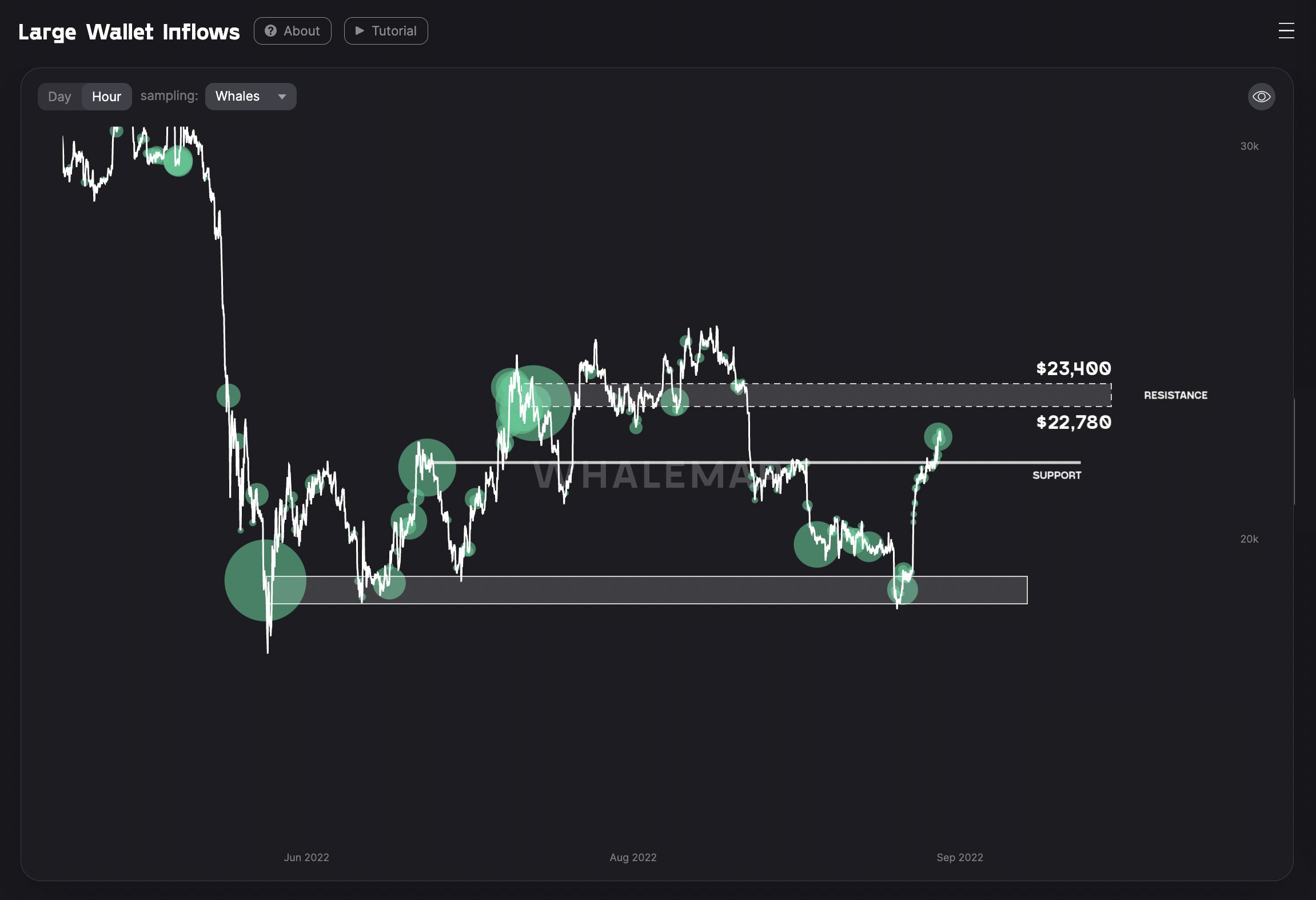 “The new area to keep an eye on: $22,780 – $23,400,” the Whalemap team told Twitter followers.